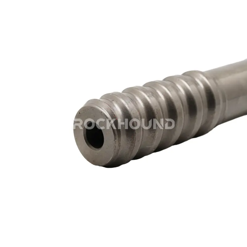 Las roscas macho T38 y T45 están rectificadas (no sólo torneadas) para garantizar la precisión del ángulo del flanco y la uniformidad del radio de la raíz. La geometría correcta de la rosca es fundamental para una transferencia eficiente de la energía: una rosca mal formada refleja la energía del impacto de vuelta al varillaje en lugar de propagarla por la barra de perforación.