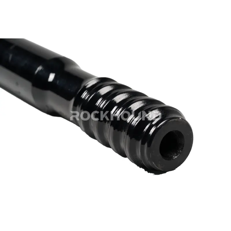 Fabricado con materiales de primera calidad ZK22CrNi3Mo (23CrNiMo) de aleación de acero y sometidos a la tecnología patentada de RockHound. Tratamiento térmico de carburación profunda de 20 horas, Cada varilla ofrece una superficie de desgaste endurecida con un núcleo elástico y resistente a las fracturas. El resultado es una herramienta de perforación que mantiene la precisión dimensional y la integridad de la rosca durante ciclos de funcionamiento prolongados, incluso bajo las cargas de percusión y las condiciones abrasivas típicas de la minería de roca dura.