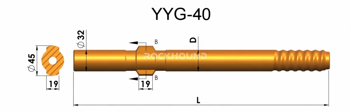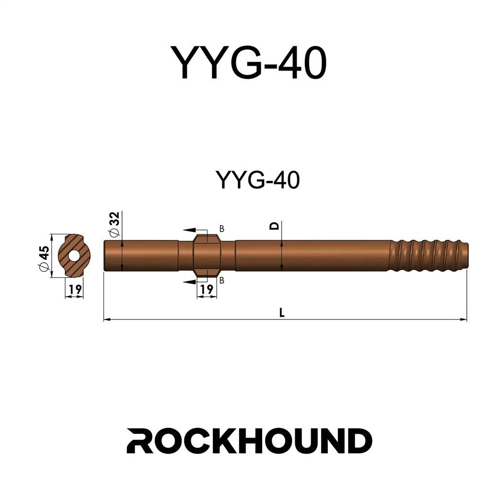 El perfil hexagonal del vástago de transmisión está rectificado con precisión para adaptarse a los portabrocas de clase YYG40 con un juego de rotación mínimo. El ajuste perfecto del hexágono al portabrocas reduce los momentos de flexión secundarios en el collar del vástago, lo que prolonga directamente la vida útil del buje delantero en el cuerpo de la broca.