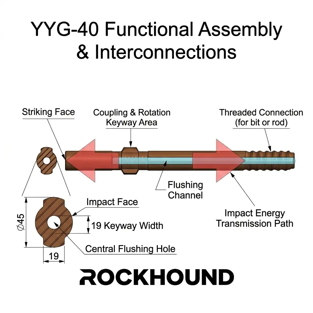 El adaptador de vástago YYG40 es el componente de acoplamiento mecánico entre una perforadora neumática de roca de clase YYG40 y la sarta de varillaje de perforación. Transmite tanto la energía de impacto percusivo del pistón de la perforadora como el par de rotación del portabrocas a la varilla de perforación y la broca. Es un elemento consumible que debe sustituirse periódicamente debido al desgaste de la rosca y a la fatiga de la cara de impacto.